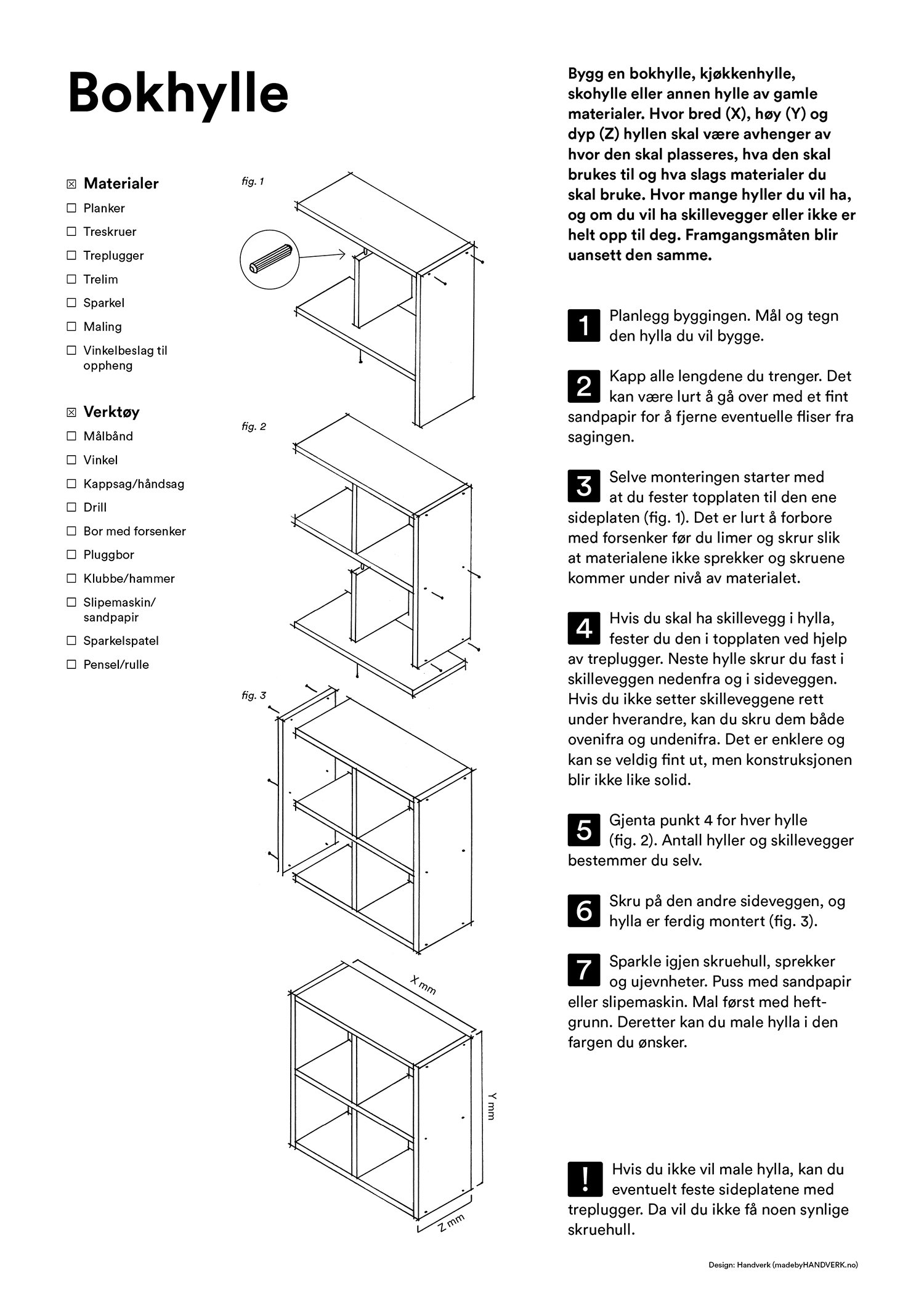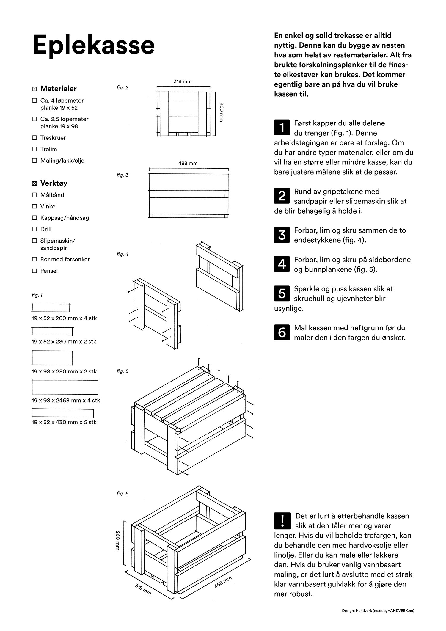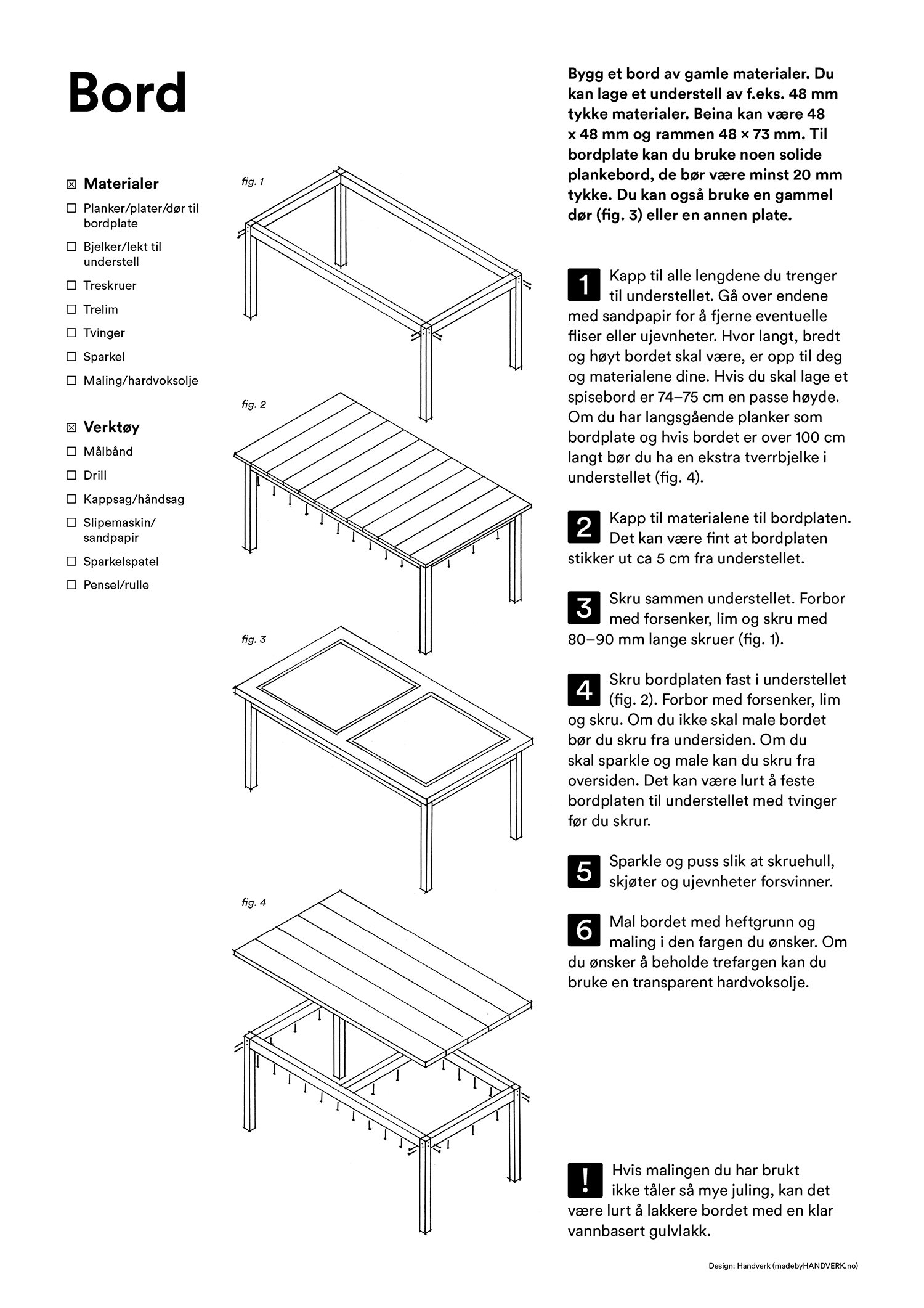 Her finner du enkle arbeidstegninger til både bord, hylle, kasse, krakk og verktøykasse du kan snekre av gjenbrukte materialer. La overskuddsmaterialer gå fra verdiløst til verdifullt. Lykke til!