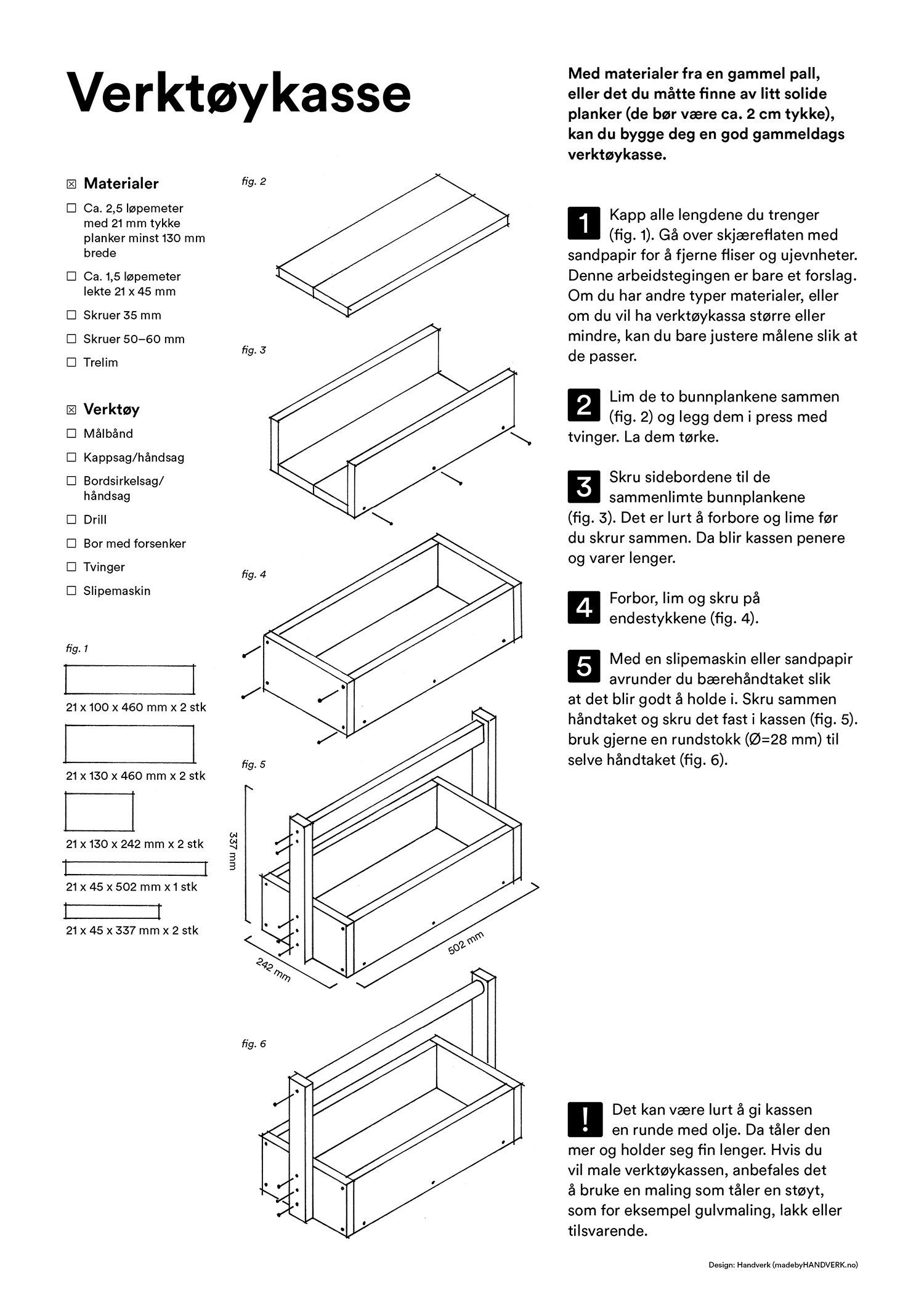 Med materialer fra en gammel pall eller det du måtte finne av litt solide resteplanker (minst 2 cm tykke), kan du bygge deg en god gammeldags verktøykasse.